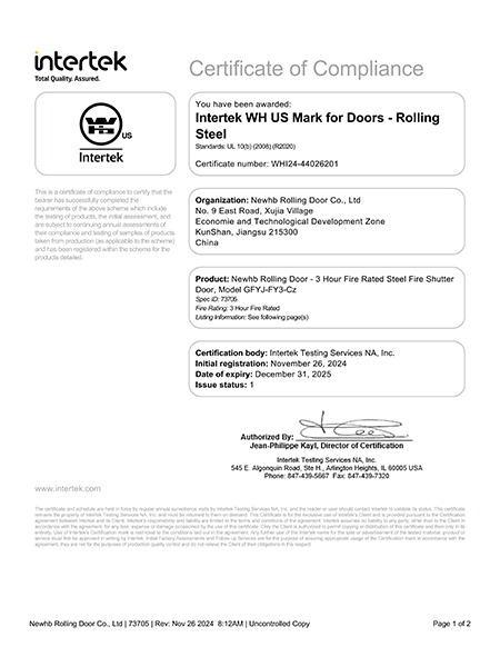 TUV Bulletproof Test Report TUV Blast 1000kPaTest Report Fire Shutter EN1634-1:2008 certificate TUV Blast 450kPa Test Report Fire shutter EN1634-1:2014 Explosion-proof rolling door CT4 certificate SGS WIND RESISTANCE TEST REPORT UL10b Certificate of Compliance A new rolling shutter door support system ISO9001 QMS Certification SGS Anti-typhoon test report An anti channeling and easy disassembly driving spindle fixing device for fireproof rolling shutter door A new automatic correction system for rolling shutter anti string sheet Certification certificate of steel fireproof and smoke proof rolling shutter fire protection products Certificate of special grade fireproof rolling shutter (inorganic) fire protection products A levelness correction system for special grade fireproof rolling shutter door curtain A verticality correction system for special grade fireproof rolling shutter door curtain A new rolling sectional assembled rolling shutter door box cover A quick disassembly recycling roller shutter door transportation material rack A quick disassembly recycling roller shutter door transportation material rack A new integrated door rail for special grade fireproof rolling shutter door A pressure sensing safety device for stopping rolling shutter door in case of resistance A new type of composite door panel A composite door rail for rolling shutter door